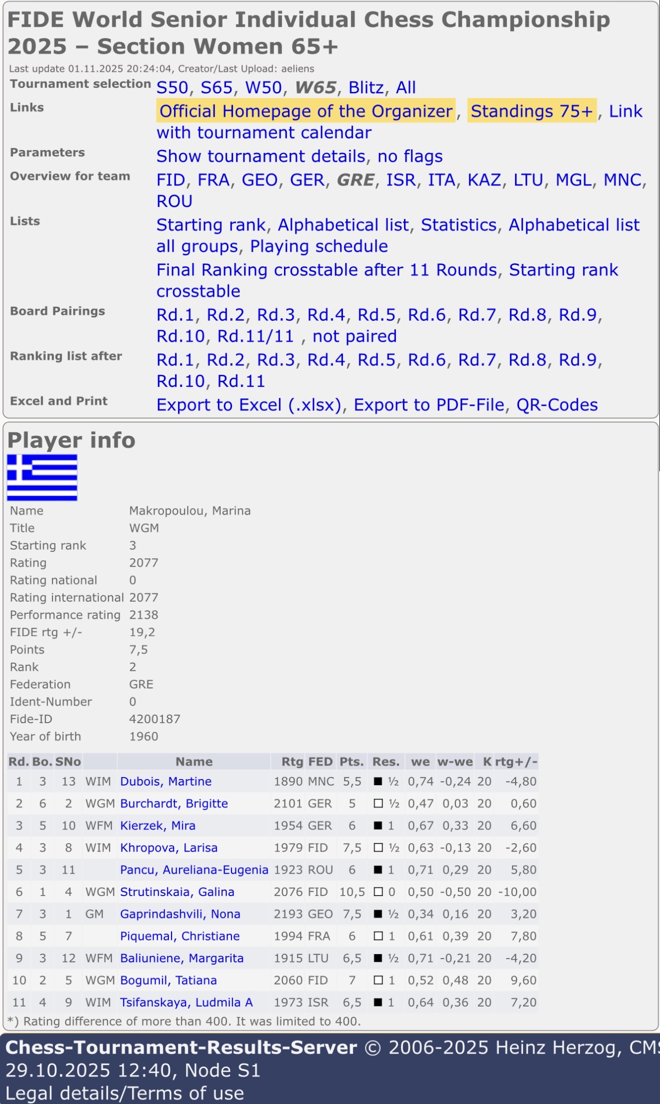 Η Ελληνική Σκακιστική Ομοσπονδία (ΕΣΟ) εκφράζει τη βαθιά της υπερηφάνεια για τη νέα σπουδαία διεθνή διάκριση της WGM Μαρίνας Μακροπούλου, η οποία κατέκτησε τη 2η θέση στον κόσμο στο FIDE World Senior Individual Chess Championship 2025, που διεξήχθη στη γειτονική Ιταλία, στην κατηγορία Γυναικών 65+.